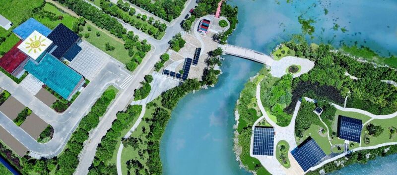 新能源板块是海陵区重点发展的新兴战略产业。该展馆采用图文、视频及产品实物等形式,详细介绍了海陵新能源产业发展历程以及未来规划。通过产业链图谱从上游原料到下游应用展现了完整的光伏产业链,并且以“一粒沙子的旅程”为主题系统介绍光伏组件从石英砂到硅片,再从电池到光伏组件的全生产工艺流程。展厅对面因地制宜打造零碳建筑样板项目是由三座小型建筑和一座构筑物组成,代表住宅、会议、咖啡厅等。项目将光伏与道路、景观、墙面、屋面等深度融合,实现光伏发电全景式应用。