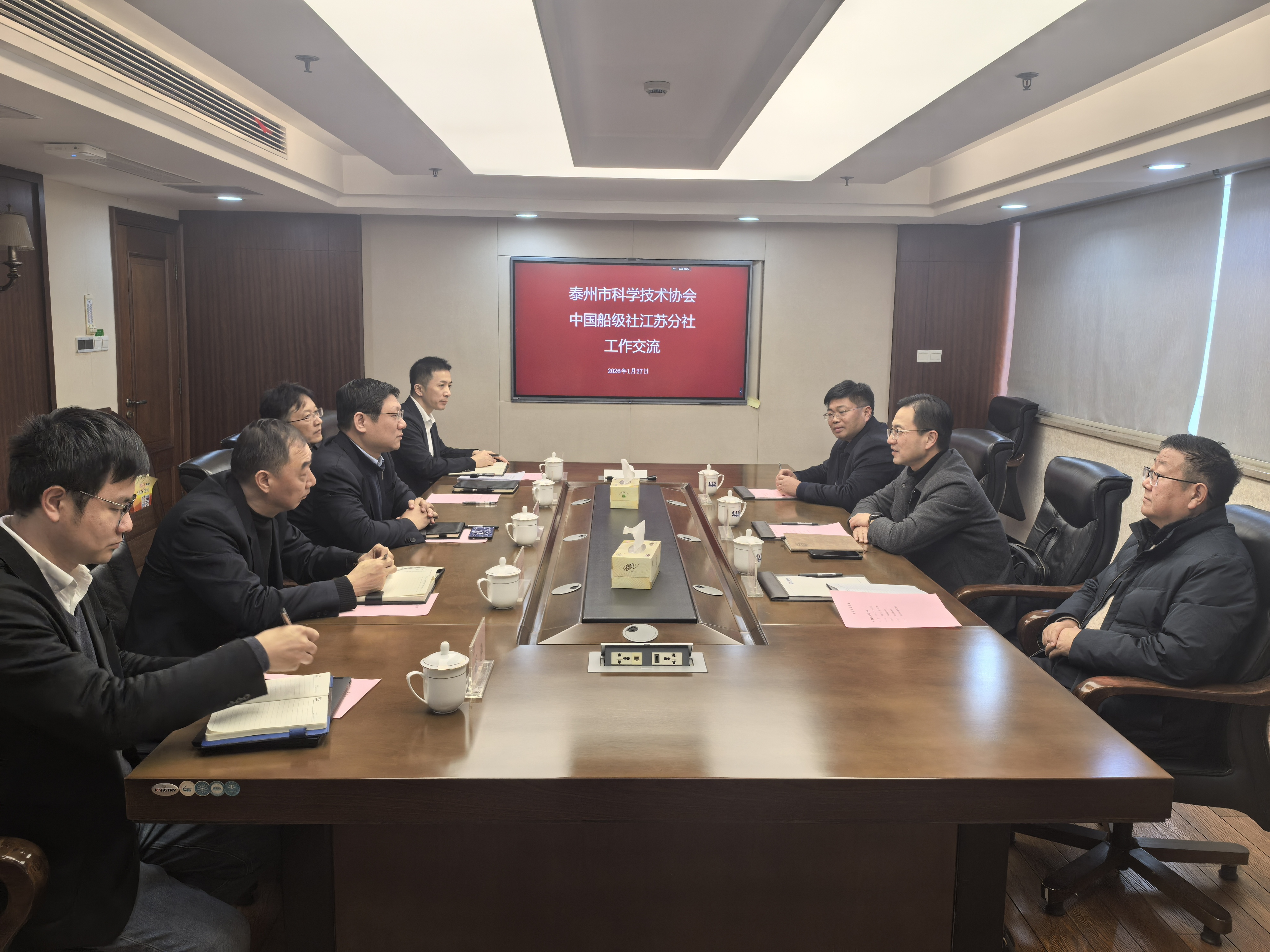 泰州市科协三级调研员朱三峰,省造船工程学会秘书长谢荣,中国船级社江苏分社纪委书记、副总经理杭仲九和产品检验处、综合业务处等相关部门负责人参加会谈。